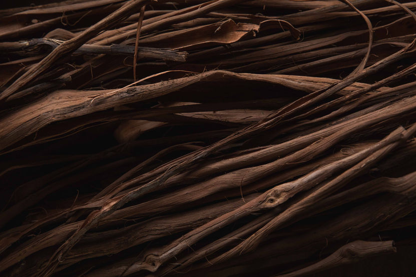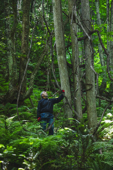 梅雨の時期が終わる頃、奥山という人里離れた山中で逞しく自生する蔓を採取します。採取する蔓の大きさ(直径)には一定の基準を設け、基準値に満たない蔓はむやみに採取せず、翌年以降に先延ばすことで種を枯渇させない工夫や、伐採した以上の植林を行いながら天然の恵を分けてもらいます。